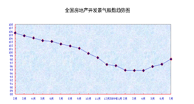 7月份,全國(guó)房地產(chǎn)開(kāi)發(fā)景氣指數(shù)(簡(jiǎn)稱“國(guó)房景氣指數(shù)”)為98.01,比6月份提高1.46點(diǎn)。