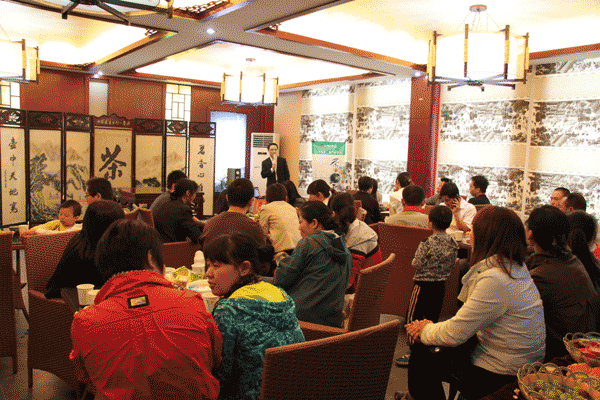 營銷中心大廳活動現場經過精心布置,為客戶觀摩交流搭建了一個溫馨的小天地。歡快的民間絲竹樂曲聲中,客戶及家屬們先后落座,一邊品茗,一邊交流著各自關心的事情。
