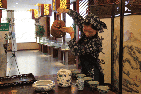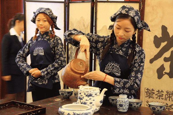 首先表演的是農家茶。只見八仙桌上擺著茶具:青花瓷壺、瓷罐、瓷缽、湯甌、銅水壺。伴隨著江南絲竹典雅宛轉的曲樂,三位姑娘輕盈出場。她們頭系蠟染頭巾,身穿青花小褂,外圍繡花圍裙,簡樸大方、明快素雅,濃郁的鄉(xiāng)村氣息撲面而來。