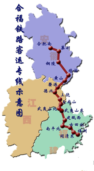 合福鐵路客運(yùn)專(zhuān)線(xiàn)是京福鐵路客運(yùn)專(zhuān)線(xiàn)的重要組成部分,是溝通華中與華南地區(qū)的一條大能力客運(yùn)通道。自合肥南站引出,經(jīng)安徽巢湖、銅陵、績(jī)溪、黃山,江西婺源、上饒,福建武夷山、南平,至福州站,線(xiàn)路全長(zhǎng)806公里,其中江西境內(nèi)184km。沿線(xiàn)共設(shè)婺源、德興、上饒、五府山、武夷山北、武夷山東、建甌西、南平北、古田北、閩清東、福州11個(gè)車(chē)站。項(xiàng)目由鐵道部和福建省、江西省政府三方投資建設(shè),項(xiàng)目建設(shè)工期為4年半。主要技術(shù)標(biāo)準(zhǔn)為雙線(xiàn)客運(yùn)專(zhuān)線(xiàn),速度目標(biāo)值為250km/h。
