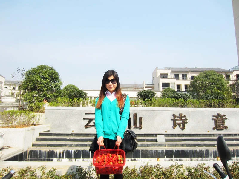 一路上,大家個個興奮極了,騎著各自的“小毛驢”歡聲笑語。抵達目的地后,只見一排排白色塑料布搭起的蓬子整齊的排列著,像幾條銀蛇在寬闊的田野里游動,大家都迫不及待地下了車,提著籃子各自進了蓬子。忽然,一陣草莓的清香撲鼻而來,放眼望去,蓬子里像鋪上了一層綠色的地毯,草莓花不多,零零星星點綴著,如同碧天里的星星。這時,大家都忙彎下腰,急切地尋找那些穿著紅衣服、戴著綠帽子的“小娃娃”,把它們美滋滋地放在自己的籃子里。將近中午,只見每個人的籃子里面都裝滿了誘人的大草莓,于是大家提著各自的勞動成果滿載而歸。