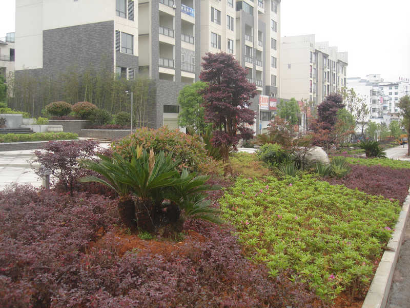 2 、充分考慮植物季相的變化。本工程植物造景注重季相的變化,考慮到四季枝葉的變化。根據(jù)植物的性狀,以豐富的植物種類形成春花爛漫、夏蔭濃郁、秋色絢麗、臘梅飛雪 的四季景觀。觀花植物貫穿于春夏秋冬。如春季的觀花植物有春鵑、山茶、茶梅、紅花繼木、紫玉蘭、黃玉蘭、樂昌含笑、櫻花、垂絲海棠、紅碧桃、紫荊、含笑、香泡等。夏季開花的植物有木槿、廣玉蘭、夾竹桃、豐花月季、紅花六月雪等。秋季開花的有金桂、黃山欒樹、夾竹桃、木芙蓉、紫薇、夏鵑、合歡、絲蘭、花石榴等。冬季觀花的植物有黃臘梅、紅梅、結(jié)香等。在本工程中,不僅有大量觀花的植物,還種植了很多觀葉的植物,如紅葉石楠、紅楓、烏桕、金絲垂柳。每當(dāng)紅葉石楠新葉長出的時候,枝頭上紅艷艷的,煞是好看!深秋季節(jié),葉子火紅的烏桕,紅楓很是醒目,大有“停車坐愛楓林晚,霜葉紅于二月花”的意境。深秋季節(jié)的欒樹,葉色變黃,果實紫紅,形似燈籠,十分美麗。冬季的無患子,滿樹金黃,猶如一棵“黃金樹”。還有芭蕉、八角金盤、曬金珊瑚等等,都是很好的觀葉植物。在本工程中,不僅有觀花和觀葉的植物,還根據(jù)居住區(qū)綠化種植的特點,種植了居民都喜歡的花果植物,如枇杷樹、香泡樹等等。給忙忙碌碌的人們創(chuàng)造“一年四季君須記,最是橙黃桔綠時”的意境。桂花是我地人們很喜歡的一個品種,因此,在各區(qū)塊、宅間種植了金桂、銀桂、四季桂等大小各種桂花180余株,每到金秋季節(jié),滿樹金黃,滿園飄香,進(jìn)入小區(qū)的人們,想必會心曠神怡吧!