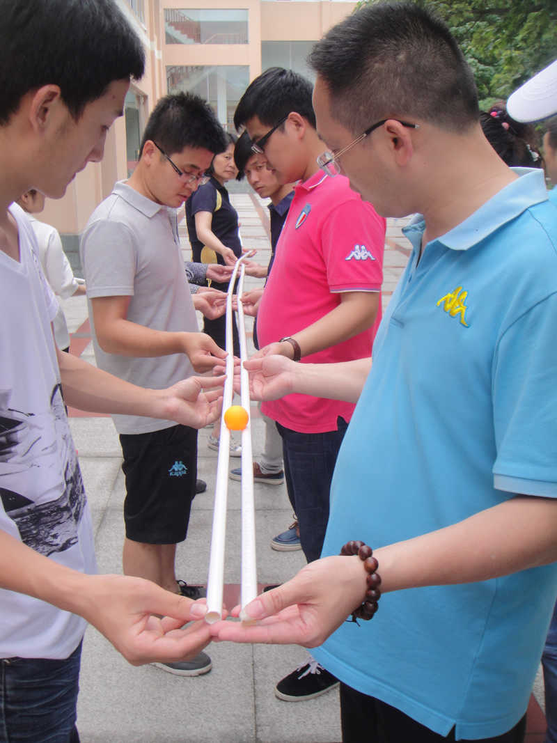 第二個(gè)項(xiàng)目是珠行萬里——要求組員利用手里的塑料管通過兩兩連接配合,在不用手觸碰的情況下將乒乓球運(yùn)到遠(yuǎn)處的一個(gè)礦泉水瓶瓶口并固定住。雖然兩隊(duì)都完成了任務(wù), 但2組用時(shí)更少最終獲得勝利,而1組在比賽過程中不放棄、不拋棄的團(tuán)隊(duì)精神深深的感動(dòng)了所有人,2組全體人員都給予他們熱烈的掌聲。